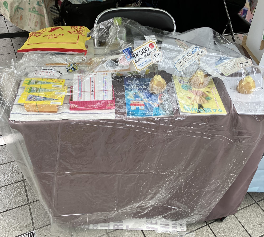 当日は風が強かったので見本誌のみ机の上に出して重石を置いてあります。