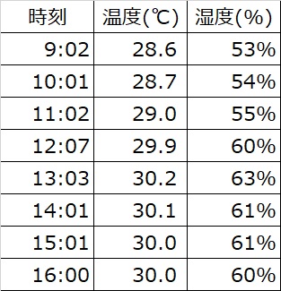 温度湿度ともピークは14時頃でした。