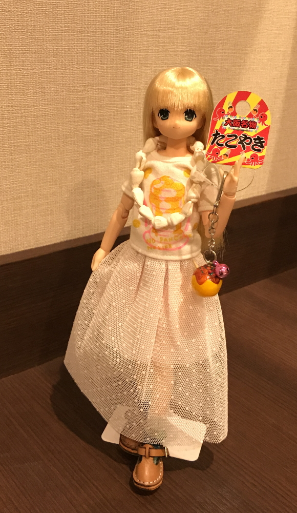 ▲大阪店で購入したチュールスカート、コンビニで買ったたこ焼きキーホルダー、フォロワーさんに頂いた貝殻ネックレス、とフル装備した看板娘おいもちゃん