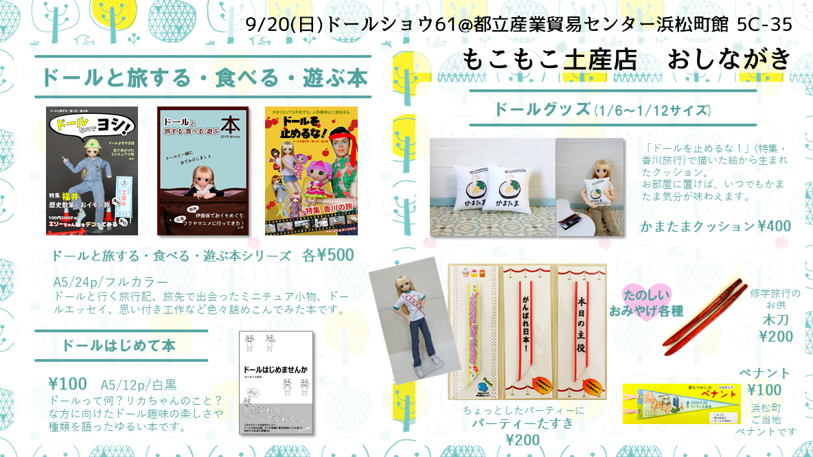 9/20(日) ドールショウ61秋 おしながき (2020/9/19 ペナントが完成しましたのでお品書き画像を差し替えました) 9/20(日)に都立産業貿易センター浜松町館で開催されるドールショウ61 秋にサークル参加します。 ▲おしながき 都立産業貿易センター浜松町館は、9/14(月)に開業したばかりの東京ポートシティ竹芝の2階~5階を占める展示室です。 行き方はドールショウのこちらのページにも写真入りで詳しく出ています。 新しい施設なので、どんなところなのかとても楽しみです。 今回は久しぶりのドールイベントですので、ドール小物も多めに持参します。 いつもなぜか売り切れてしまって申し訳ない"かまたまクッション"も多めに作りました。 また、1/6サイズペナントは、会場の立地をモチーフに毎回書き下ろしたデザインを予定しております。作者Bがただいま鋭意製作中です。お楽しみに! ご入場にあたっては、新型コロナウィルス対応などいくつか必要事項がありますので、ドールショウHPをご確認ください。 [1回]PR