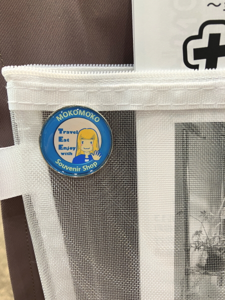 ▲サークル布前面に設置したチラシケースとそれを支えるピンバッジ