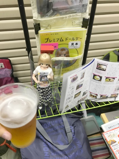 ▲おいもちゃんとビール。もこもこ土産店の「ドールと旅する食べる遊ぶ本」も置いています。