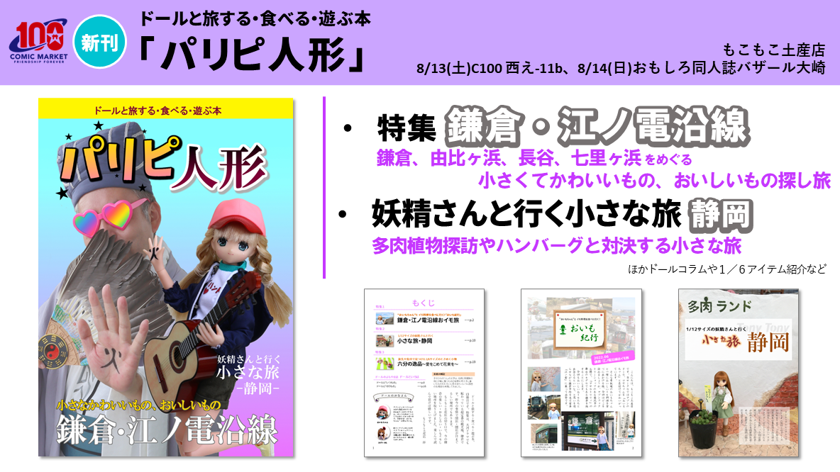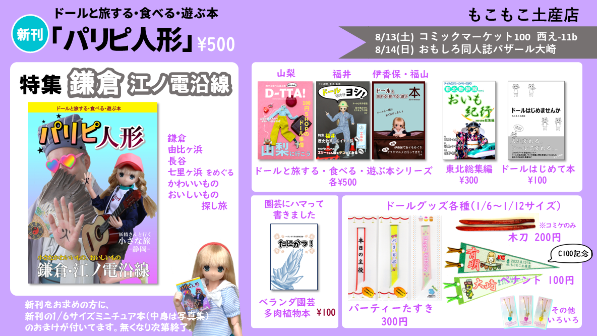 おしながきはコミケと翌日の大崎を兼ねています。100回記念のペナントや、新刊の表紙にちなんだパリピパーティーたすきも用意してみました。