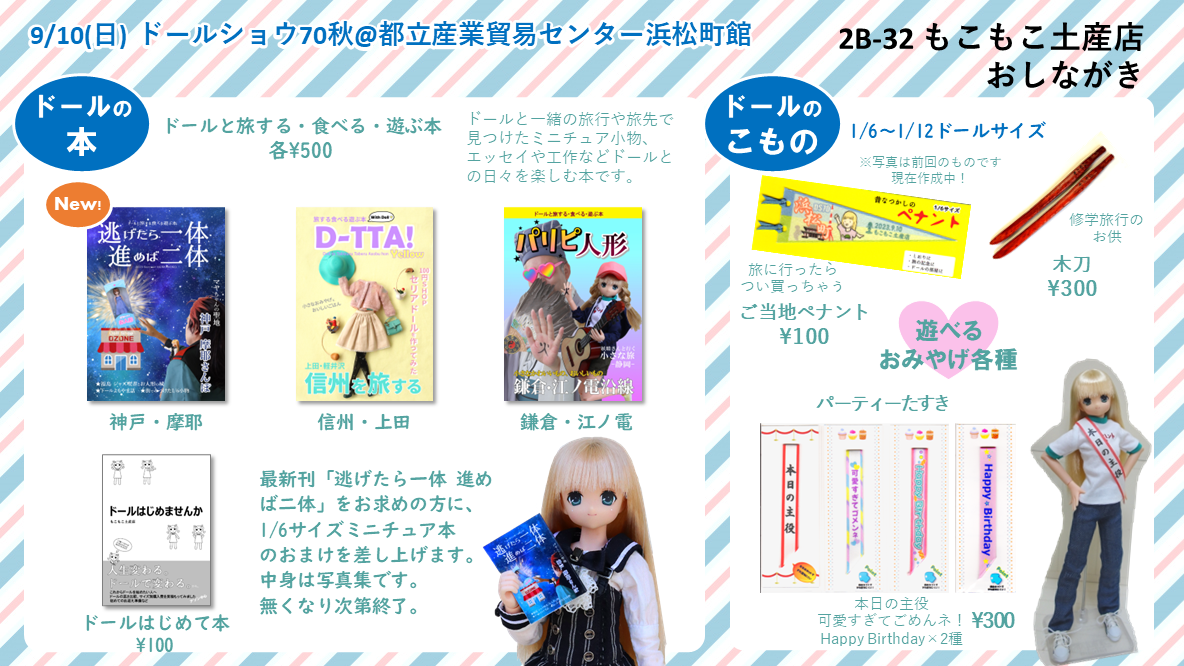 2023/9/10(日)に都立産業貿易センター浜松町館で開催されたドールショウ70秋にディーラー出展しました。