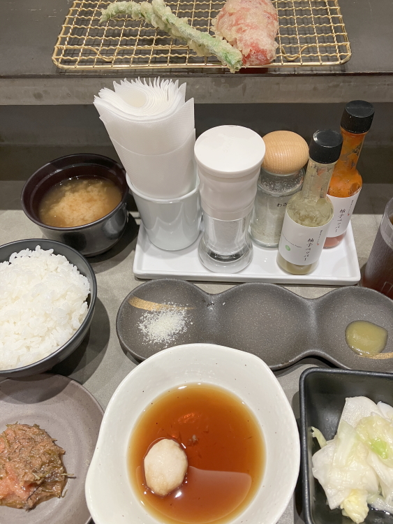 季節によって天ぷらの素材が変わります。この日はいんげん、赤ピーマン、ズッキーニ、ヤングコーン、海老、鱧(はも)の梅肉風味、オクラでした。