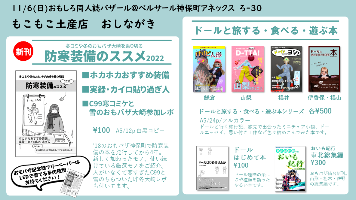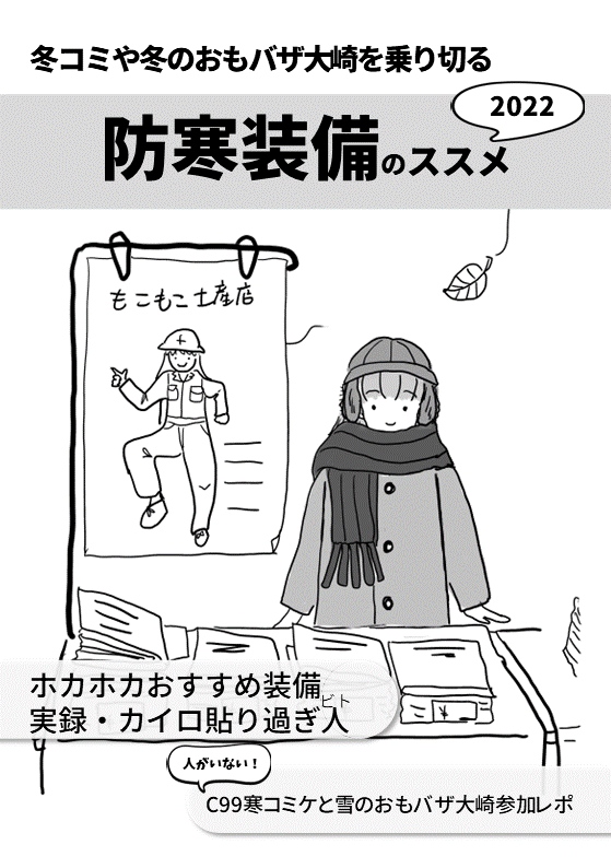当サークルのメインジャンルのドールとは全く関係が無いのですが、冬コミと冬の大崎駅前で開催されるおもしろ同人誌バザールで着るための防寒装備について、という非常に狭いテーマの本です。買ってくださった方、ありがとうございます!