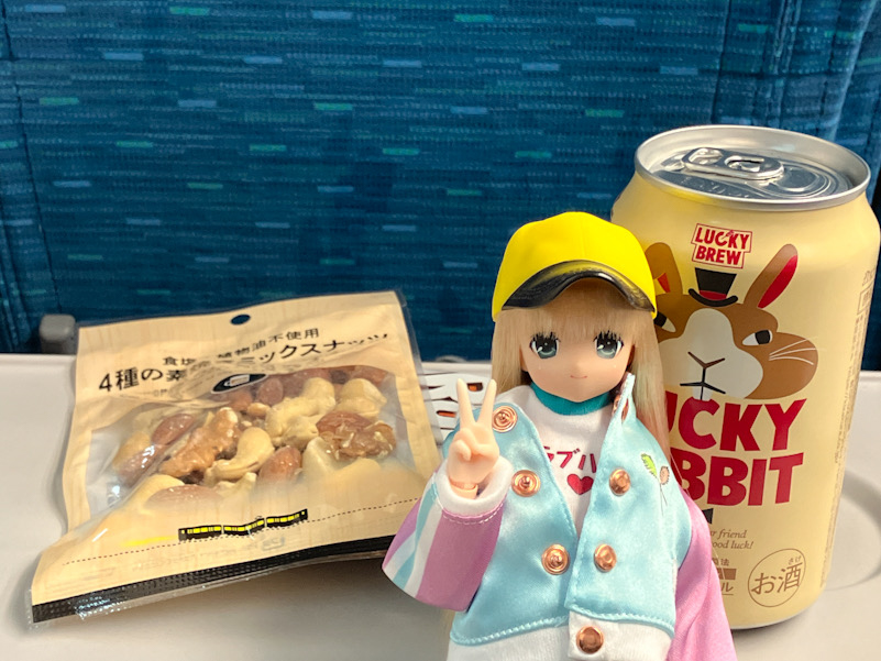 新幹線でどこかに行くたびに同じ構図の写真を撮っている気がしますが、今回もビールとおつまみとおいもちゃんです。