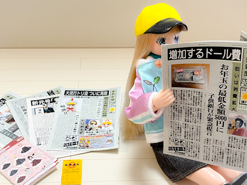 ▲ツイッターのフォロワー様からの差し入れ、ころんちゃんと太陽の塔とのスリーショット、フォロワー様自作ドール新聞と駐車禁止ステッカー(ドールサイズ)