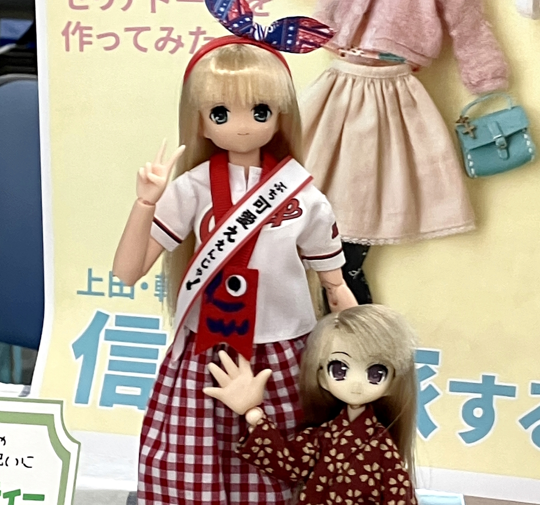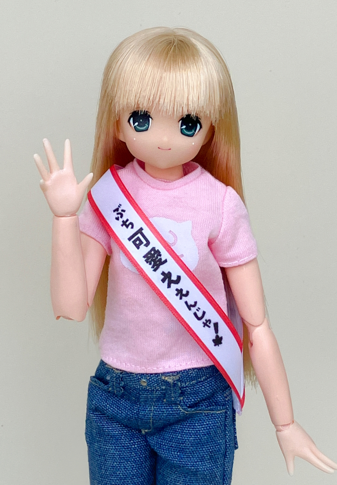 たすきは1/6~1/12サイズのドール向け。写真のドール(おいもちゃん)は1/6サイズでオビツ24の素体を使用しています。